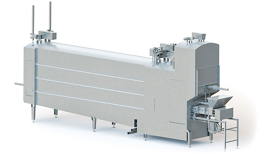 System for moulding and cooling pasta filata cheese in stainless steel moulds.