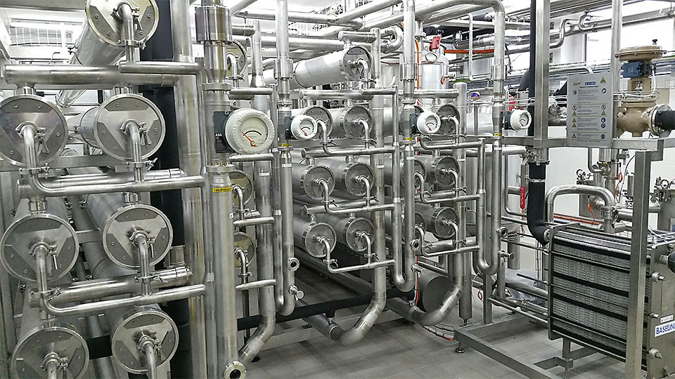 RO HighTS proces voor de productie van melk, weiconcentraat of UF permeaat met droge stof tot 36%. Gebruikt voor volumereductie door efficiënte concentratie vóór de verdamper, besparing, transportkosten, of waterterugwinning/hergebruik.