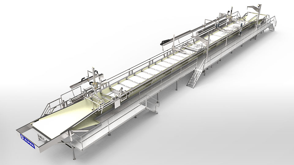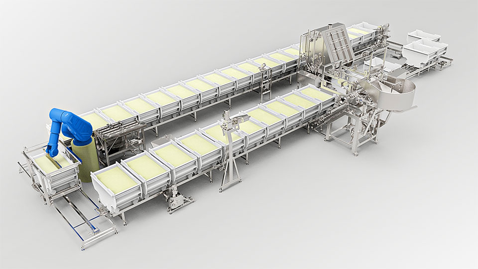 Half- of volautomatische lijn voor het verwijderen van de kaas uit de blokvormen met behulp van een vacuüm.