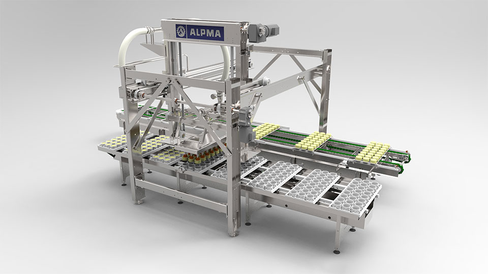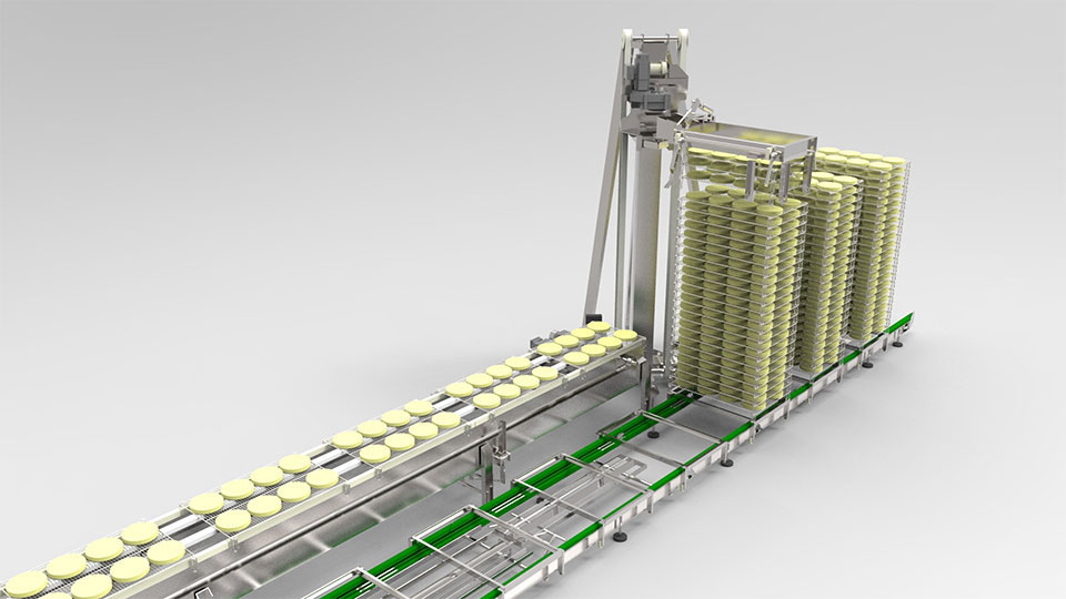 Eenheden voor het stapelen, ontstapelen en verplaatsen van productiemateriaal (bijv. kaasvormen).